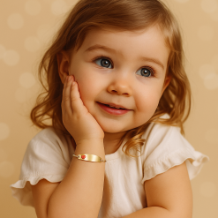 Brățară cu plăcuță pentru copii. Este potrivită, deopotrivă, atât pentru fete cât și pentru băieței. Poate fi purtată încă de la naștere. Și, mai mult de atât. Aceste brățări pot fi gravate cu numele sau inițialele celor care le poartă. Iar serviciul de gravură oferit de MOSV, Mă Ofer Să Visez, este pus gratuit la dispoziția clienților. Inimioare, figurine, animale, mașini de curse, ursuleți, delfini și nave spațiale sunt elemente din universul copilăriei care completează această colecție. Sunt create din aur, cu finisaje extraordinare, cu elemente de siguranță și lungimi ajustabile. Aceste brățări din aur pentru bebeluși sunt unul dintre acele cadouri amintire care nu vor sfârși într-una din numeroasele cutii pline cu jucării. Pentru că își vor găsi cu siguranță loc în caseta de bijuterii a familiei. Sunt genul de cadouri pe care le numim bijuterii de familie, bijuterii care pe lângă în utilitatea lor imediată, au o altă proprietate mult mai însemnată – legătura creată între cel care o oferă și cel care primește bijuteria, o punte peste ani. Va fi amintirea ta, elementul vostru de legătură, punctul care unește trecutul cu prezentul și care va merge către viitor, o bijuterie putând fi cu ușurință transmisă de la o generație la alta.