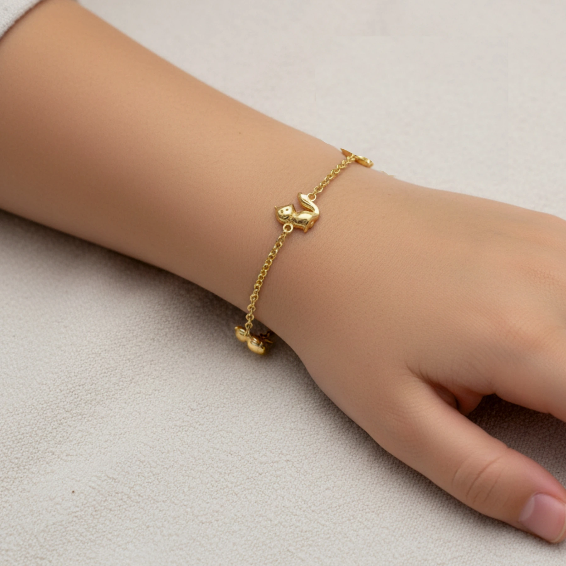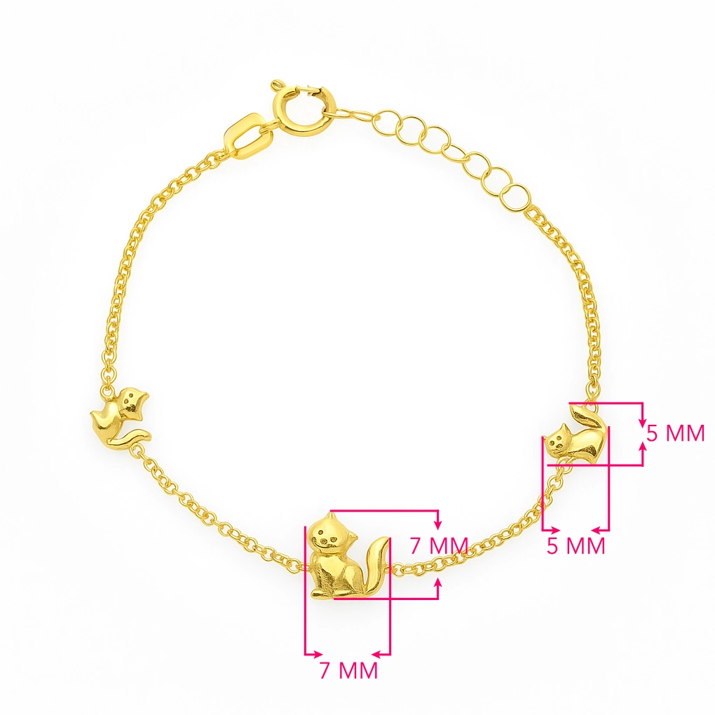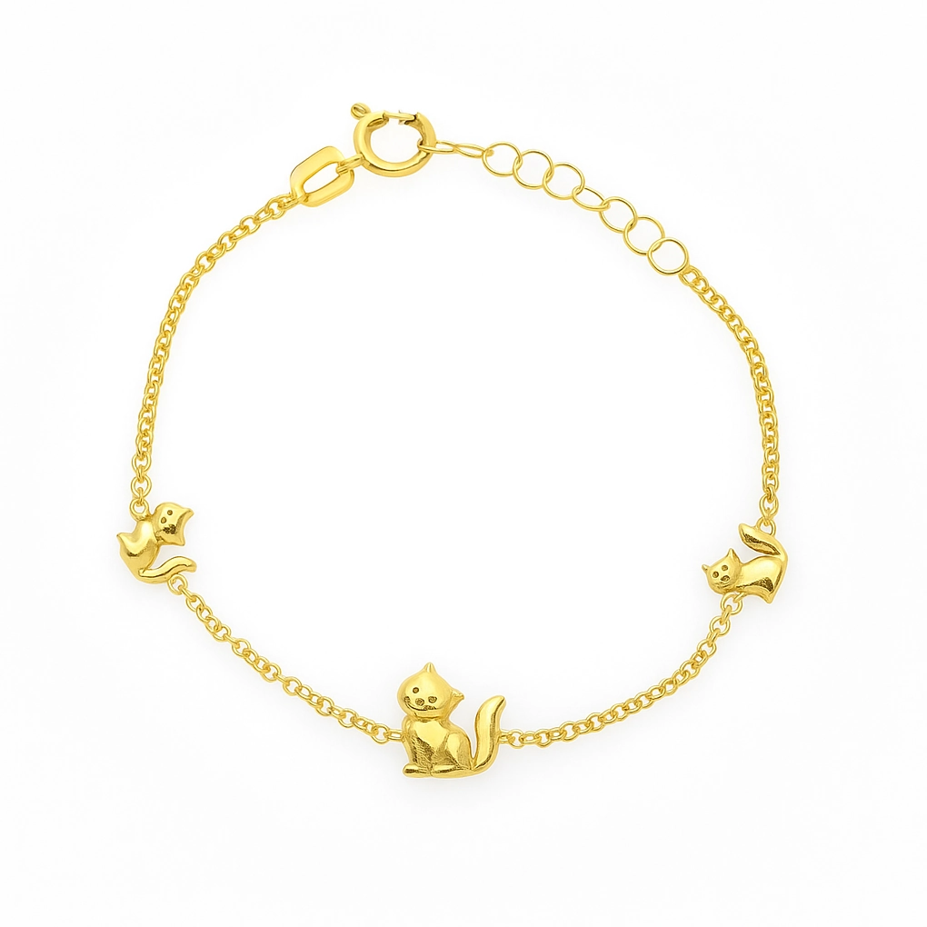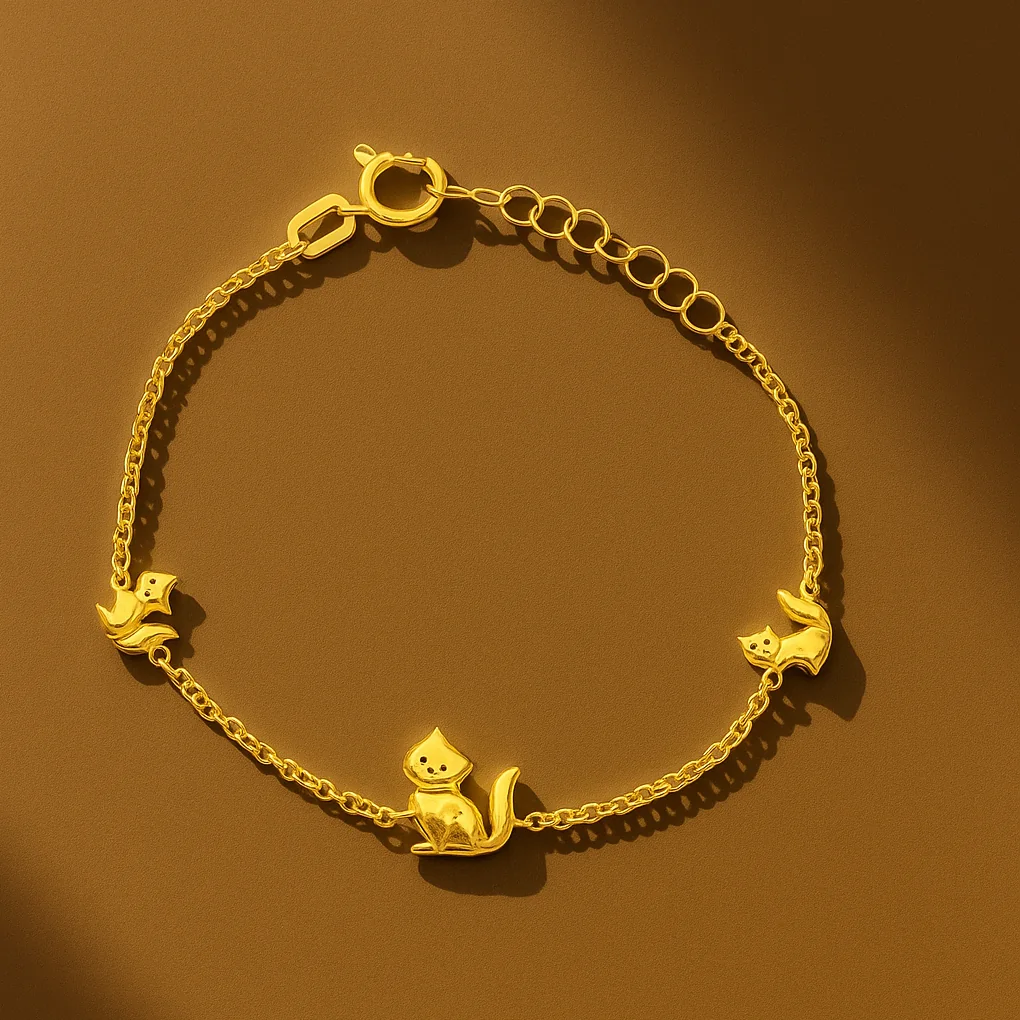 Această brățară cu pisicuțe realizată din aur de 18 karate este o bijuterie plină de farmec, creată pentru cei care iubesc pisicile și magia copilăriei. Cele trei pisicuțe jucăușe, atent finisate, dau brățării un aer delicat, luminos și vesel, perfect pentru micii visători.