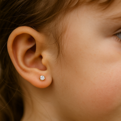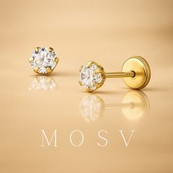 Lungimea tijei / Cercei copii, aur 18KT, închidere protecție. Lungimea tijei tuturor cerceilor MOSV (partea care intră în ureche) este de 7,5 – 8 mm. Dimensiunea poate fi ajustată prin înfiletarea mai strânsă sau mai lejeră a căpăcelului de siguranță, iar asta îi face potriviți de la naștere până la vârsta adultă. Prin înșurubarea căpăcelului, lungimea tijei se reduce cu 2 – 3mm. În cazul în care considerați că lungimea acesteia este prea mare, puteți solicita scurtarea acesteia după introducerea datelor de livrare în procesul de finalizare al comenzii. Procedura de modificare a tijei este gratuită.