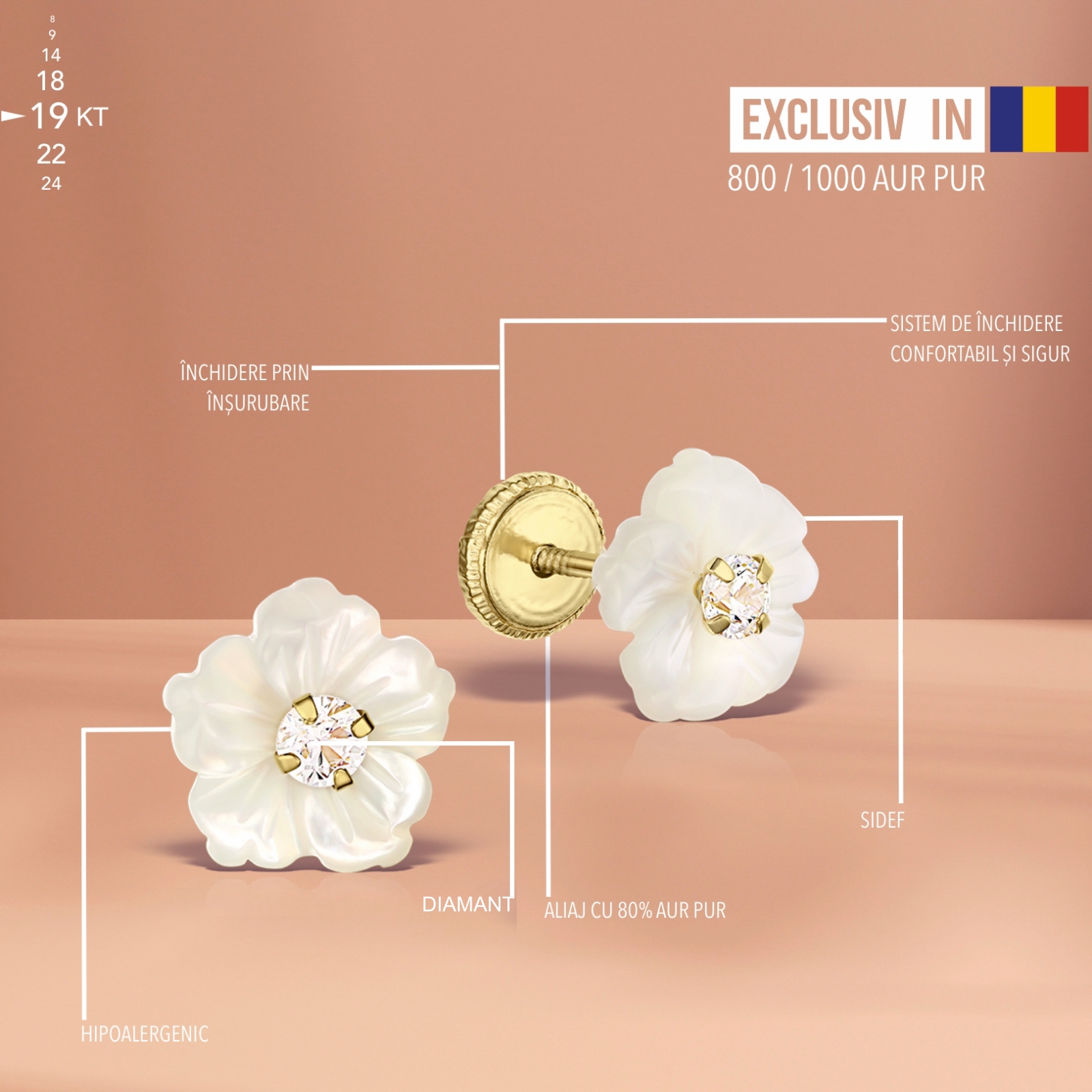 Cercei pentru copii din aliajul cu cea mai mare cantitate de aur pur din România: 800/1000. Non-alergic, fără conținut de nichel și cadmiu. Hipoalergenici, siguri și confortabili. Acum și în varianta cu diamante de 0,12 ct total (culoare culoare H, claritate Si).