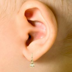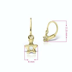Cercei din aur galben de 14 karate cu sistem de închidere tortiță, decorați cu pietricele cubic zirconia. Sunt ușori, special creați pentru a nu simți că îi au în urechiușe (pentru a nu trage de ei) și pentru a nu deforma lobul urechii în perioada de creștere.