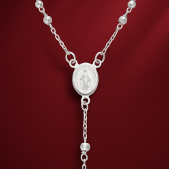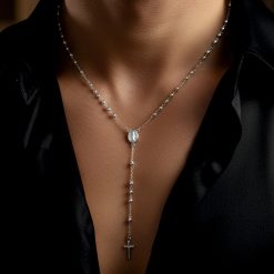 Rozariu din aur alb, format colier, podoabă sacră pentru creștini. Un cadou care va rămâne o amintire prețioasă peste ani.