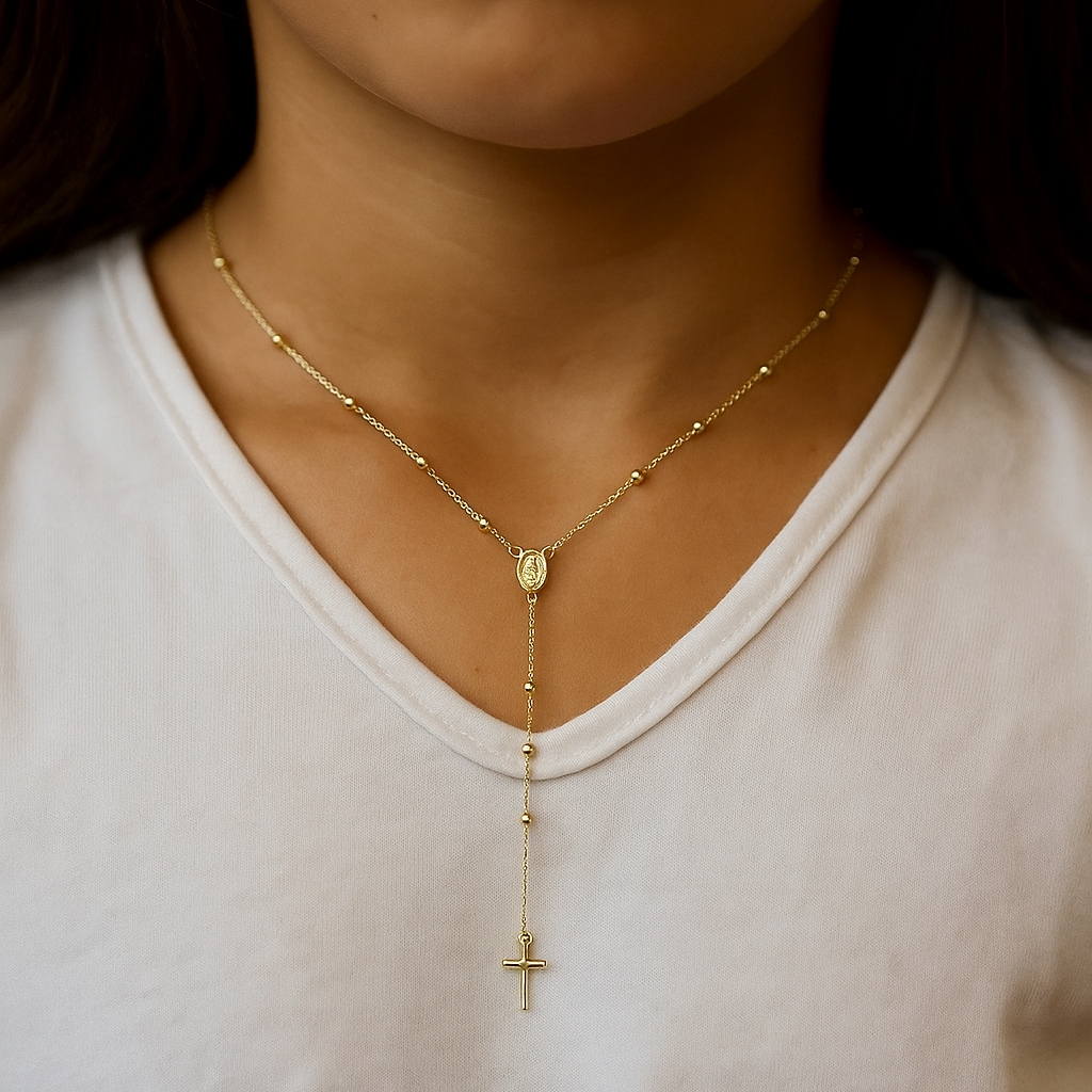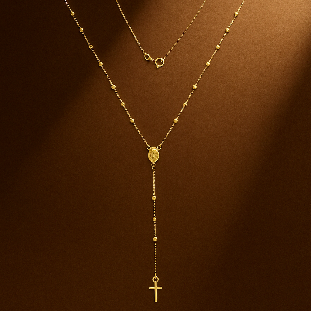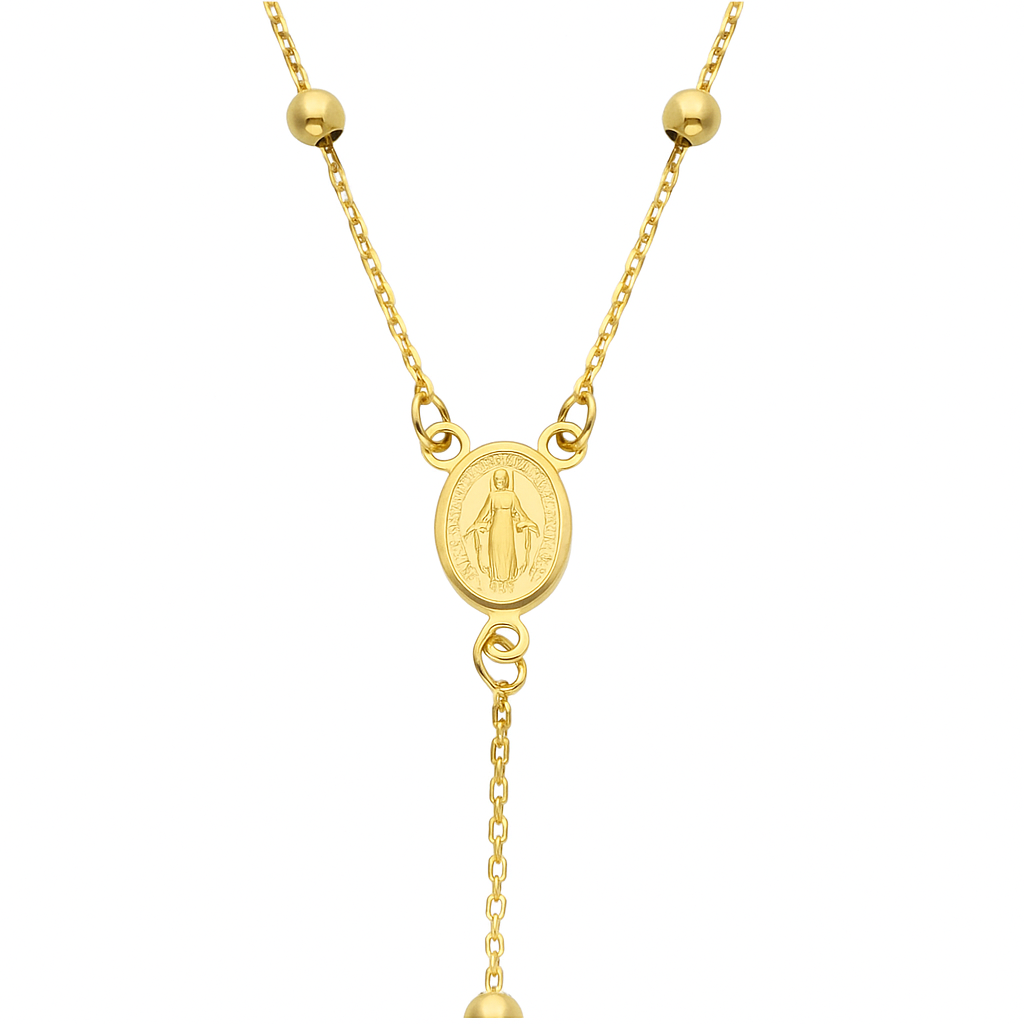 Rozariu din aur, format colier, podoabă sacră pentru creștini. Un cadou care va rămâne o amintire prețioasă peste ani.