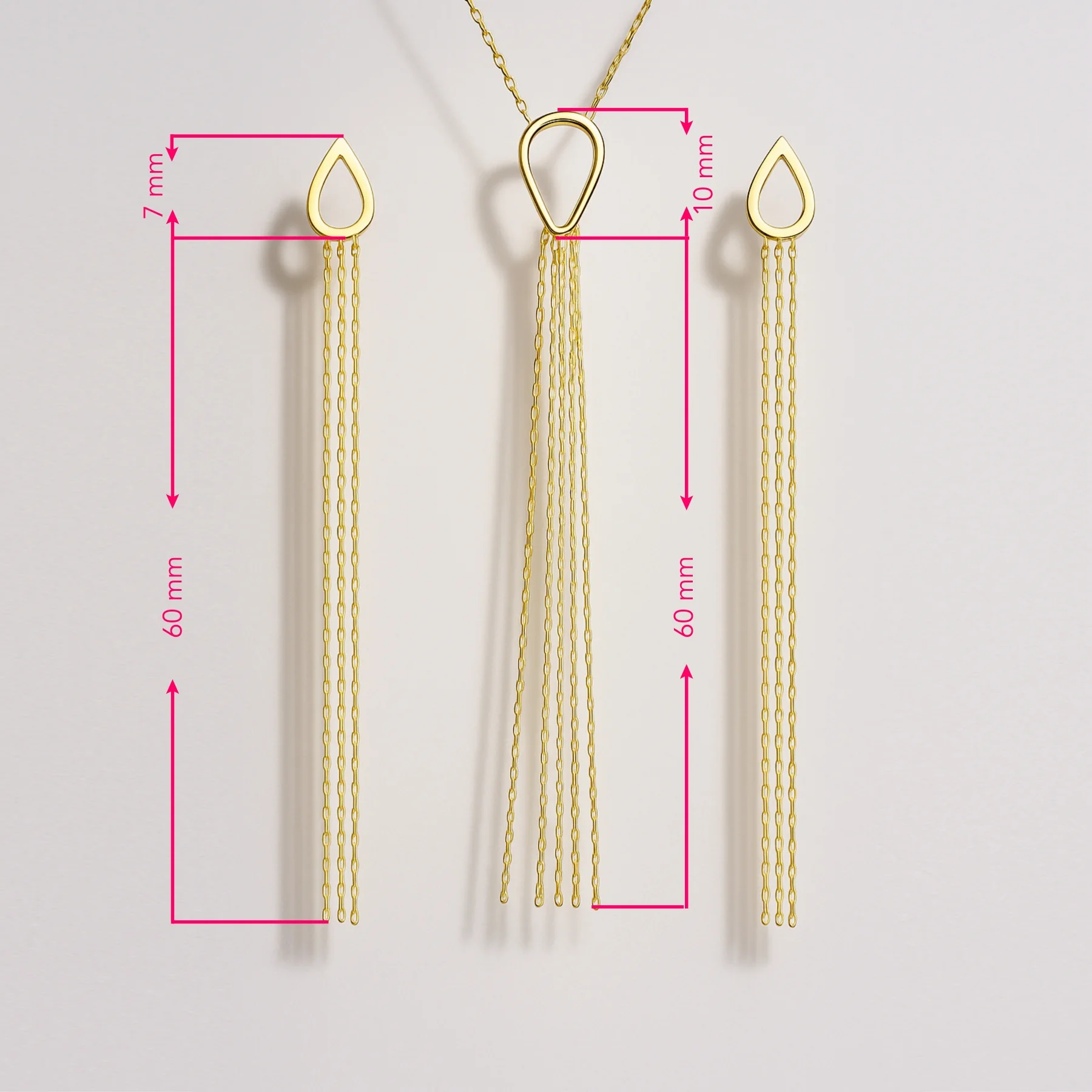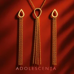 Colierul completează setul prin același motiv de picătură alungită, din care se desprind lănțișoarele subțiri din aur de 18K, creând o linie verticală elegantă, ideală pentru decolteurile simple. Purtați împreună, cerceii și colierul transformă orice ținută – de la rochii de ocazie la cămăși albe – într-una cu aer rafinat și sigur de sine.