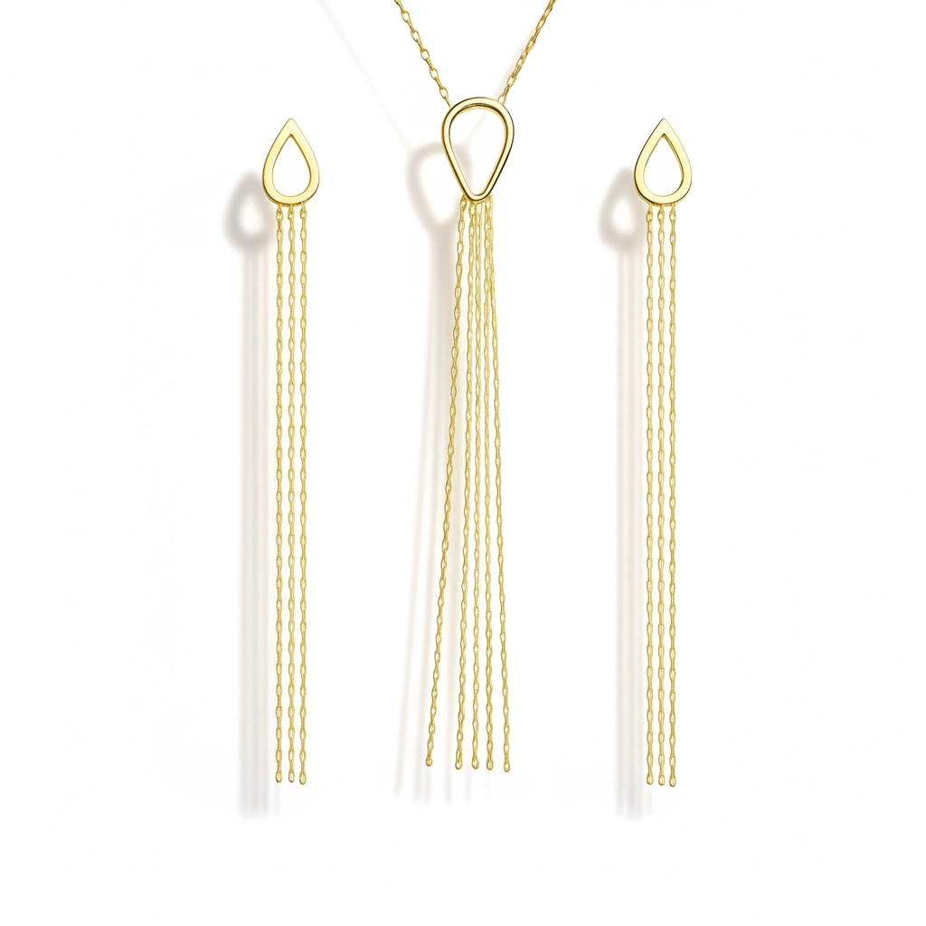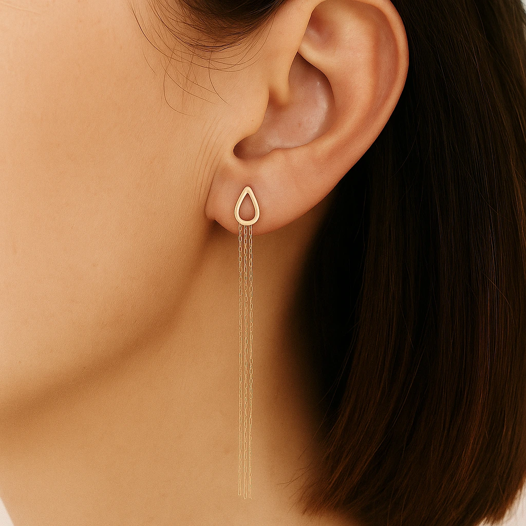 Baza fiecărui cercel este o siluetă stilizată de picătură, din aur lucios, din care coboară șiruri fine de lanț – o „cascadă” fluidă care urmează discret linia gâtului la fiecare pas. Cerceii au sistem de închidere cu fluturaș clasic, de adult, închis prin împingere, ceea ce îi face ușor de montat și de purtat pe tot parcursul zilei. Sunt gândiți pentru adolescente, dar la fel de potriviți pentru dame care preferă un design curat, contemporan, cu impact vizual puternic.